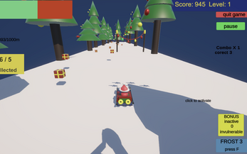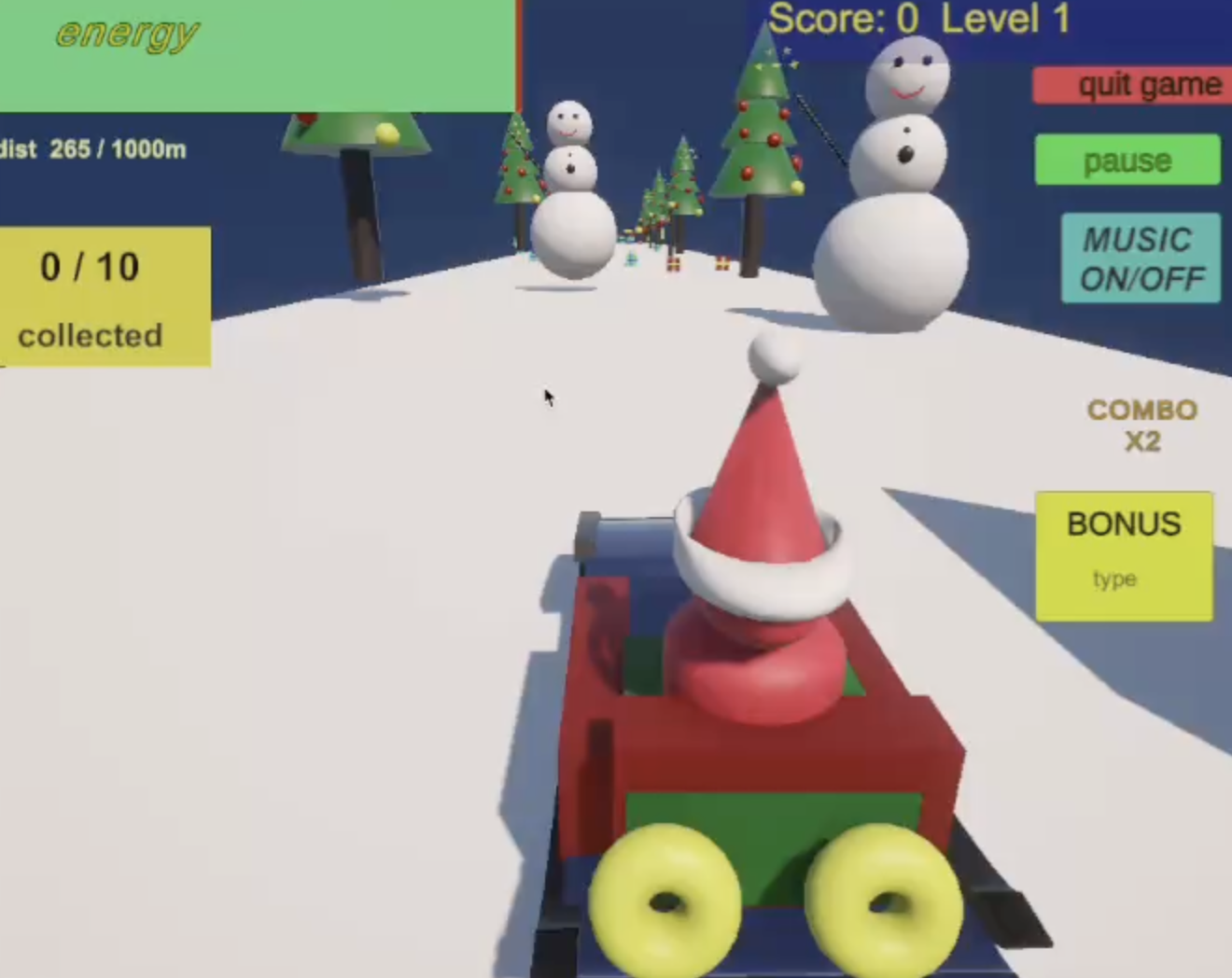 This is my first Unity game, I'm still learning. It's an Infinite Christmas Runner where you have to collect presents, avoid obstacles, collect bonuses and finish the run.